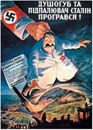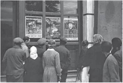 Проаналізуйте джерела за запропонованими запитаннями. • 1. Що роблять зображені на фото мешканці Харкова? Які деталі свідчать про те, що люди почуваються заляканими і деморалізованими? Що, на вашу думку, вони відчувають? • 2. З якою метою створено плакат? Чому і навіщо німецькі пропагандисти наголошують на злочинах режиму Сталіна? Які спільні риси притаманні тогочасній пропаганді різних режимів?