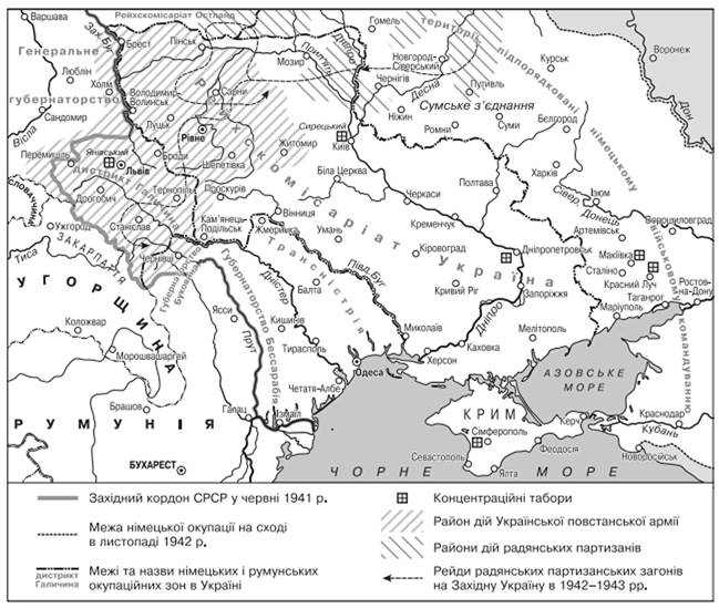 2. Покажіть на карті адміністративно-територіальні утворення часів нацистського окупаційного режиму на території України. Визначте їхні особливості: географічне розташування, держави-окупанти тощо.