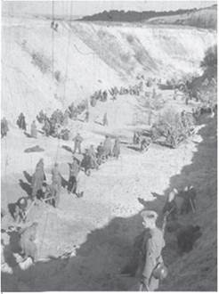 Військовополонені засипають землею ділянку Бабиного Яру, де лежать розстріляні євреї. В охороні есесівці. Початок жовтня 1941 р.