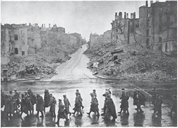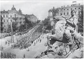 Радянські солдати ведуть німецьких військовополонених вулицями Києва. 16 серпня 1944 р.