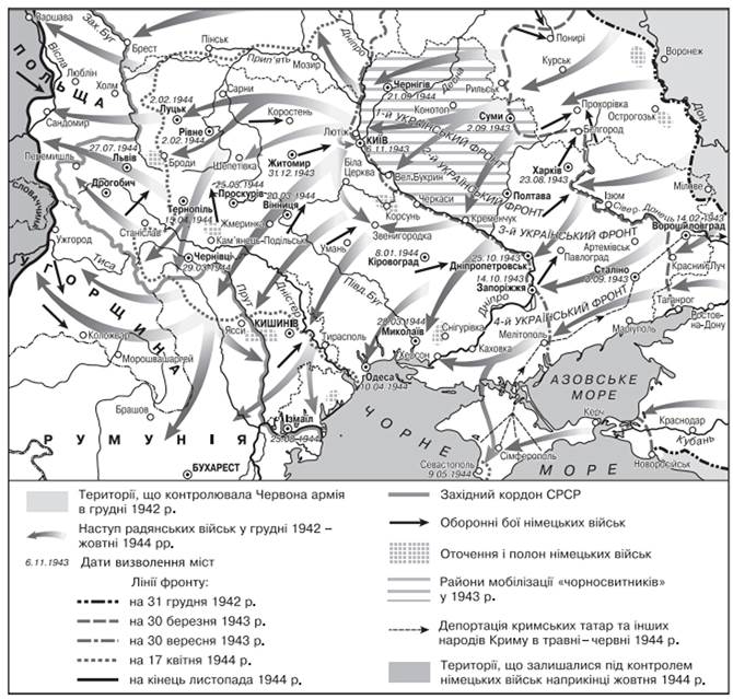 • Нові, невиправдані жертви викликав наказ Сталіна взяти Київ перед 7 листопада до чергової річниці «Великого Жовтня». • На початку травня 1944 р. майже вся Україна, крім маленької смужки земель на заході, була в руках радянської влади. • Примусове виселення майже всього кримськотатарського населення Криму стало однією з найшвидше проведених депортацій в історії людства.