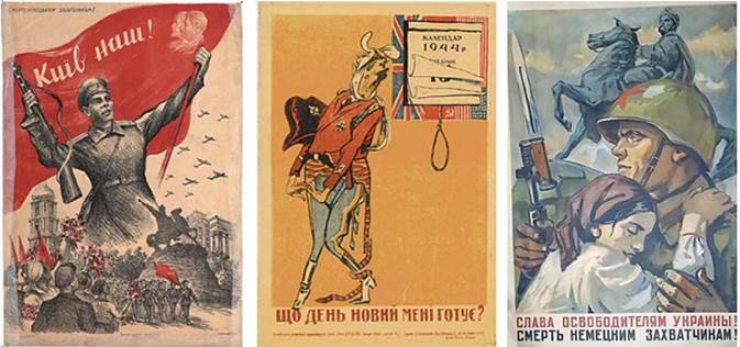 Проаналізуйте радянські плакати, виконайте завдання і дайте відповіді на запитання. • 1. Порівняйте їх із тими, що виготовлені на початку німецько-радянської війни. Що змінилося в оформленні? Які образи залишилися, а які зазнали змін? • 2. Як пропагандисти прагнули вплинути на почуття радянських людей?