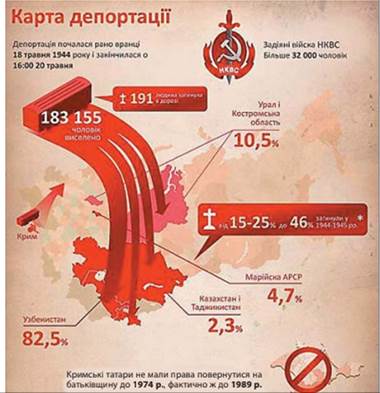 11 травня 1944 р. Державний комітет оборони ухвалив рішення про виселення з Кримської АРСР і переселення в Узбецьку РСР кримських татар. Окремі факти співпраці з нацистами стали підставою для того, щоб депортувати близько 200 тис. кримських татар. Їх переселили не лише в Узбекистан, а й у Марійську АРСР та в кілька областей Росії.