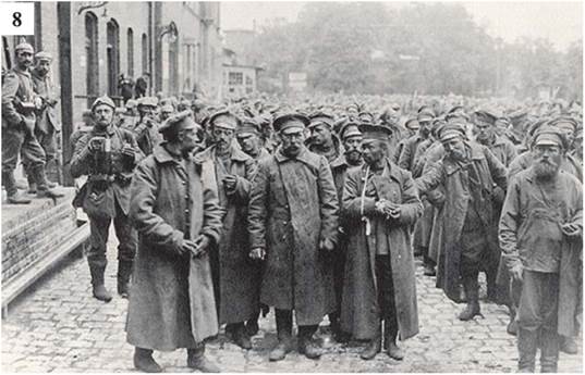 Проаналізуйте джерела 5-8, виконайте завдання і дайте відповіді на запитання. • 1. Роздивіться людей на фотографіях. Про які почуття і настрої говорять їхні обличчя, постаті й жести? Чи співчуваєте ви цим людям? • 2. Які нові явища соціального життя постали внаслідок воєнних подій? Чи були з-поміж них такі, що згодом могли спричинити важливі суспільні зрушення?