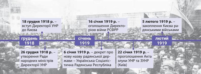12 січня, завдавши поразки Сірожупанній дивізії Армії УНР, радянські формування увійшли до Чернігова. Інші червоноармійські частини 19 січня захопили Полтаву, 27 січня — Катеринослав, а 1 лютого - Кременчук. Надзвичайно погіршив ситуацію перехід на бік більшовиків отаманів Н. Григор’єва і Зеленого (Д. Терпила). Наприкінці січня 1919 р. Лівобережна Україна опинилася в руках більшовиків. 5 лютого 1919 р. червоні війська вступили в Київ. А навесні радянську / совєтську владу було встановлено на всій території України, крім Надзбруччя і західних областей.