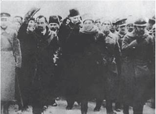 Голова Директорії УНР В. Винниченко та член Директорії С. Петлюра під час параду українських військ на Софійській площі з нагоди вступу Директорії до Києва. 18 грудня 1918 р.