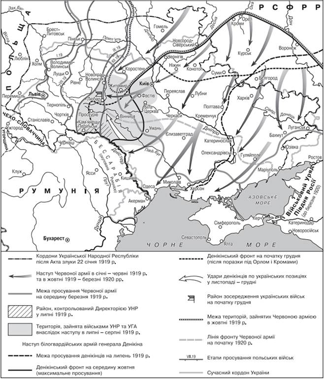 «Оголосивши війну Совітській Росії, Директорії нічого більше не залишалось, як горнутися під крило Антанти. Чи хотіла вона того, чи не хотіла, стратегічне становище на східноєвропейському революційному фронті - на українській ділянці - було в той час таким: реакційний Дон захопив Катеринославщину й Таврію; Румунія захопила Буковину і Бессарабію; Польща напирала на Холмщину; Антанта розташувалася по всьому півдню України...