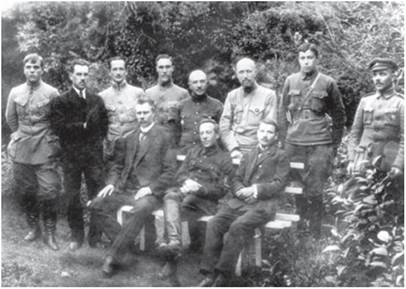Члени Директорії та воєначальники Армії УНР. Сидять члени Директорії Ф. Швець, С. Петлюра, А. Макаренко. Кам’янець-Подільськ. Липень 1919 р.