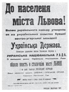 «До населення міста Львова. Волею українського народу утворилася на українських землях колишньої Австро-Угорської монархії Українська Держава. Найвищою владою Української Держави є Українська Національна Рада. З нинішнім днем Українська Національна Рада обійняла владу в столичнім місті Львові і на цілій території Української Держави. Дальші розпорядження видадуть цивільні й військові органи Української Національної Ради.