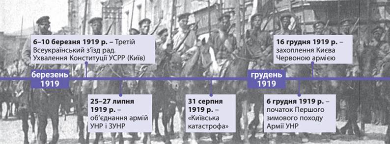 1. Установіть хронологічну послідовність подій: • початок Першого зимового походу Армії УНР • ухвалення першої Конституції УСРР • «Київська катастрофа».