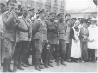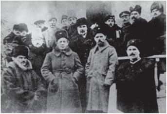 Голова Директорії УНР С. Петлюра (у центрі) серед політичних і військових діячів УНР. Праворуч від нього — М. Омелянович-Павленко