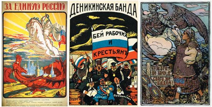 Проаналізуйте плакати і дайте відповіді на запитання. • 1. Яким політичним силам вони «належать»? • 2. Яким символічним змістом сповнене кожне зображення? • 3. Яке ставлення до подій та явищ тогочасної доби прагнули сформувати в глядачів автори?