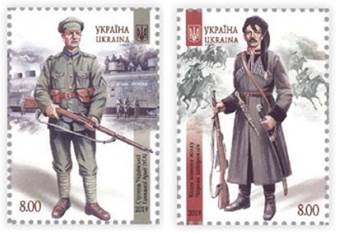 Поштові марки «Стрілець Української Галицької Армії» і «Козак кінного полку Чорних запорожців»
