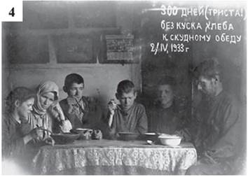 Обід родини фотографа-аматора М. Боканя. Напис на фото: «300 днів (триста!) без шматка хліба до мізерного обіду. 2/IV, 1933 р. (російською мовою)». Батурин Бахмацького р-ну Чернігівської обл. 1933 р.