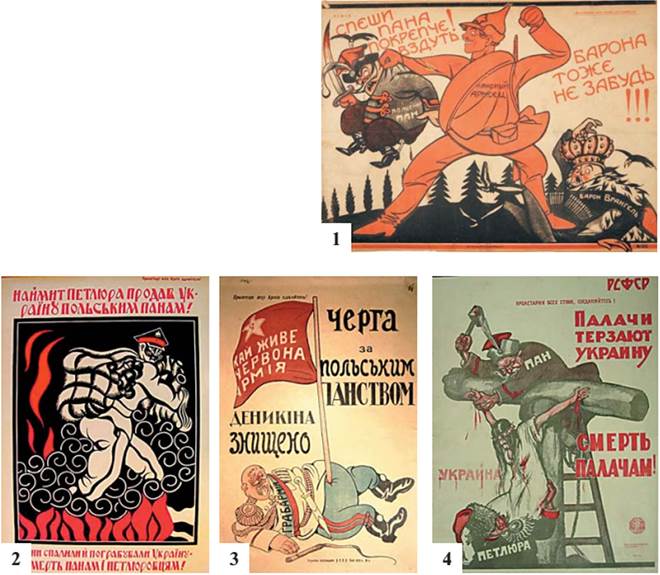Проаналізуйте джерела 1-4 і виконайте завдання. Зробіть висновок, яким напрямам політики більшовиків у 1919-1920 рр. вони присвячені. Які художні засоби використано для втілення пропагандистських ідей?