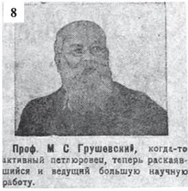 «Проф. М. С. Грушевський, який був колись активним петлюрівцем, тепер покаявся та веде значну наукову роботу»
