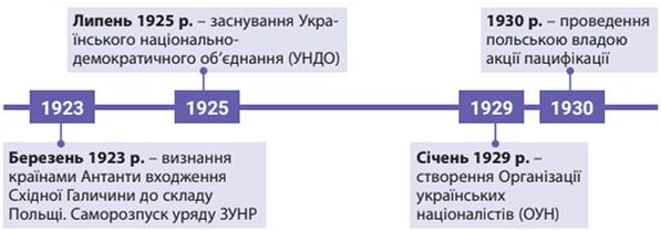 1. Установіть хронологічну послідовність подій: • створення Організації українських націоналістів (ОУН) • визнання країнами Антанти входження Східної Галичини до складу Польщі • проведення польською владою акції пацифікації • заснування Українського національно-демократичного об'єднання (УНДО).