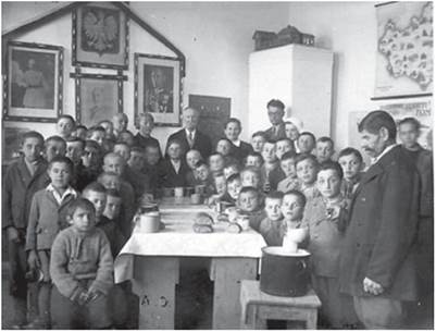 Школа в м. Підволочиськ на Тернопільщині. На стінах — атрибутика: карта і герб польської держави, портрети старих і нових маршалів та президента Другої Речі Посполитої