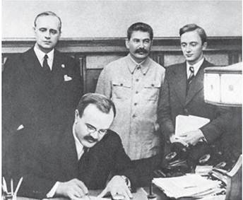 Від березня 1939 р. у Москві тяглися безрезультатні переговори з представниками Великої Британії та Франції про створення системи колективної безпеки проти країни-агресора. Саме із цього часу Сталін почав шукати можливість порозумітися з Німеччиною. 23 серпня в Москву прибув міністр закордонних справ Третього райху Й. фон Ріббентроп. Метою цього візиту було підписання згідно з попередньою домовленістю Договору про ненапад між СРСР і Німеччиною. Того самого дня, пізно ввечері, у Кремлі було підписано, а наступного дня опубліковано Договір про ненапад терміном на 10 років. Таємний додатковий протокол про розмежування «сфери обопільних інтересів» у Східній і Південно-Східній Європі, звісно ж, оприлюднено не було. До радянської сфери впливу згідно з ним належали Латвія, Естонія, Фінляндія та Бесарабія; Литву визнано сферою впливу Німеччини; територію Польщі учасники угоди поділили між собою по лінії річок Нарев, Вісла, Сян.