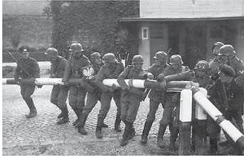 Німецькі солдати ламають шлагбаум на німецько-польському кордоні. 1 вересня 1939 р.