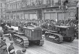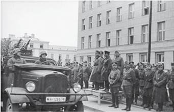 Парад з нагоди передання Бреста частинам Червоної армії. На трибуні — німецький генерал X. Гудеріан і радянський комбриг С. Кривошеїн. 22 вересня 1939 р.