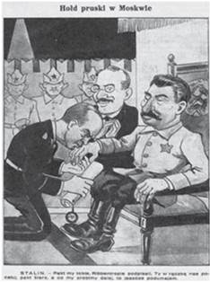 Польська карикатура на пакт Молотова — Ріббентропа «Прусська присяга на вірність Москві». Слова Сталіна: «Пакт ми тобі, Ріббентропе, підписали. Ти в ручку нас поцілуй, пакт бери, а що робитимемо далі, подумаємо».