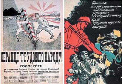 Червона армія прийшла в Західну Україну, Бессарабію та Північну Буковину з гаслами возз’єднання західноукраїнських земель з Українською Радянською Соціалістичною Республікою у складі СРСР. Радянська пропаганда наголошувала, що віднині українці - колишні громадяни Польщі та Румунії - користуватимуться всіма національними правами в єдиній радянській Україні.