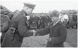 Начальник УШПР Т. Строкач вручає медаль «Партизану Вітчизняної війни» юному партизанові Рівненського партизанського з’єднання А. Білопольському. Червень 1943 р.