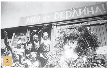 2. Група демобілізованих бійців Червоної армії, які повертаються на батьківщину. Напис на вагоні: «Ми з Берліна!» (російськю мовою). 1945 р.