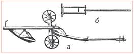 Соха з колісним передком (а). Спрощений варіант із дишлом (б)