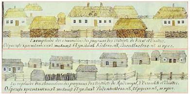 «Селянські житла [на Київщині] скрізь збудовані з дерева, вони, як правило, теплі взимку. Їх зовнішнє й внутрішнє планування всюди майже однакове... Майже всі хати вкриті соломою. Загалом у селах будинки невеликі, у них рідко буває більше однієї кімнати, перед якою є сіни, з другого боку від сіней роблять комору без вікон. У кімнаті завжди є піч. Хати заможніших селян часом просторіші, кімнати не такі тісні, у них більше порядку й чистоти, досить часто вони побілені всередині і ззовні. Внутрішнє впорядкування кожної хати майже скрізь однакове. В усіх помешканнях завжди можна бачити в кутку кімнати напроти дверей грубо намальовані образи святих у більшій чи меншій кількості, прикрашені натуральними висушеними квітами та білими рушниками, вишитими червоними узорами. У їхніх помешканнях зовсім немає меблів, хіба що іноді шафа і декілька простих стільців» (Домінік П'єр де ла Фліз).
