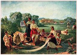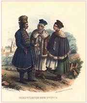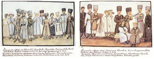 • Розгляньте зображення. Які спільні та відмінні деталі одягу міщан і селян ви помітили?