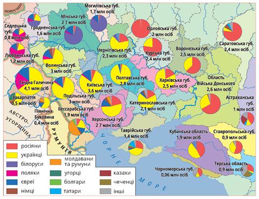 • Спираючись на карту, співвіднесіть зміни в економічному та етнічному розвитку українських земель.