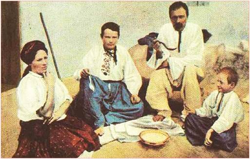 Селянська сім'я обідає біля хати. Київщина. Фото. 1906