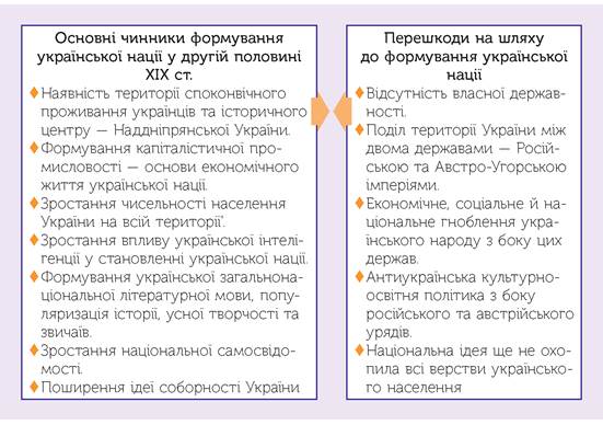 • Які чинники сприяли, а які перешкоджали формуванню української нації у другій половині XIX ст? Проаналізуйте таблицю і додайте ті чинники, яких, на вашу думку, не вистачає серед позитивних чи негативних.