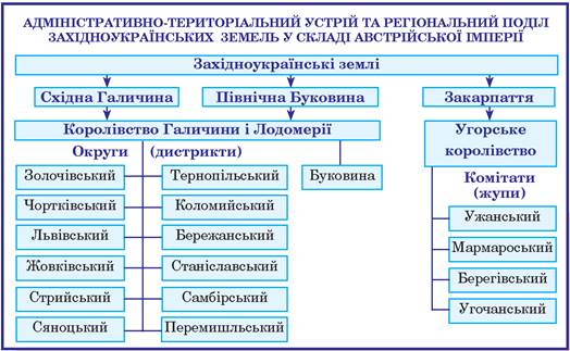 Отже, західноукраїнські землі були поділені між різними адміністративно-територіальними одиницями володінь Габсбургів, де, крім українців, проживали й інші народи. Такий поділ був зручний для імперського керівництва, бо влада передбачала, що ці народи витрачатимуть сили на боротьбу за землі та вплив у краї між собою, а не з очільниками імперії.