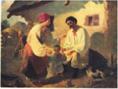 На картині зображено три покоління, котрі проживали в одній хаті. Як правило, родини були багатодітними. Чим більше дітей, тим більше робочих рук та міцніше господарство.