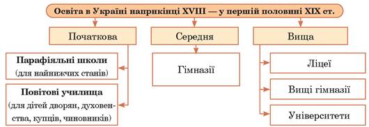 Перший вищий навчальний заклад нового типу — університет — було відкрито 1805 р. у Харкові. Він мав словесний (історико-філологічний), юридичний, математичний і медичний факультети. У 1834 р. відкрили Київський університет Св. Володимира, який мав філософський та юридичний факультети. Навчання в університетах тривало чотири роки.