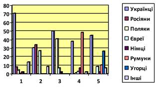 Етнічний склад населення українських земель (%): 1 — Наддніпрянської України (1897 р.); 2 — міського населення Наддніпрянської України (1897 р.); 3 — Східної і Західної Галичини (1851 р.); 4 — Північної та Південної Буковини (1851 р.); 5 — Закарпаття (1851 р.).