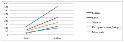 Зміна кількості населення в найбільших містах Наддніпрянщини з 1860 до 1897 року (тис. осіб)