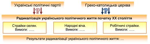 4. Доповніть схему та, спираючись на неї, підготуйте розповідь «Радикалізація українського політичного життя початку XX століття».