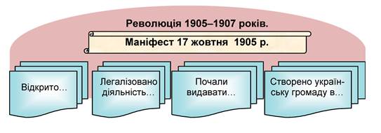 4. Доповніть схему та, спираючись на неї, підготуйте розповідь «Вплив революції 1905-1907 років на життя українців».