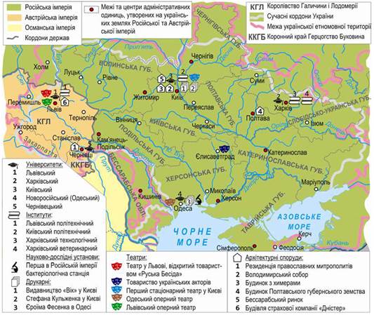 Модернізація спричинила зростання потреби в освічених людях. Вищу освіту давали університети, яких на українських землях було п’ять: Харківський, Київський, Львівський, Новоросійський, відкритий в Одесі у 1865 році, та Чернівецький, заснований у 1875 році. Почали працювати вищі навчальні заклади для підготовки спеціалістів різних галузей промисловості й духовної сфери. Найбільші — Львівський і Київський політехнічні інститути, Харківський технологічний та ветеринарний інститути. У Російській імперії навчальних закладів з українською мовою викладання не було. Натомість у Львівському університеті існувала кафедра української мови і літератури, а з 1860-х років — дві українські кафедри на факультеті права. У 1894 році була відкрита кафедра східноєвропейської (фактично української) історії, яку очолив Михайло Грушевський, а в 1900 році — кафедра української літератури під орудою Кирила Студинського. Кафедру української мови та літератури у Чернівецькому університеті очолював Степан Смаль-Стоцький.