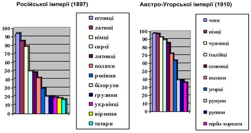 - 1. Порівняйте рівень письменності українців у Російській і Австро-Угорській імперіях. Де були сприятливіші умови для здобуття освіти?