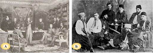 4. На світлинах зображено членів Кирило-Мефодіївського братства (А) і «Братства тарасівців» (Б). Коли й де виникли ці організації? Хто ініціював їх створення? У чому вони вбачали мету своєї діяльності? Яке значення діяльності цих товариств для українського суспільно-політичного руху?