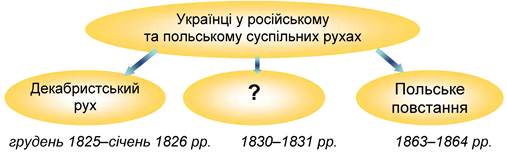 1. Яка подія пропущена у схемі? Стисло охарактеризуйте участь українців у російському та польському визвольних рухах XIX ст.