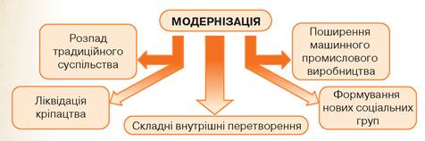 Модернізація — перехід від традиційного аграрно-ремісничого суспільства до світського, міського й індустріального, що охопив XIX — початок XX ст.