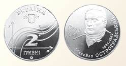 Ювілейна монета номіналом 2 гривні, присвячена 200-річчю від дня народження М. Остроградського (Національний банк України, 2001 р.)