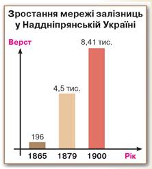 На кінець 80-х років XIX ст. в Україні залізниці сполучали між собою найбільші міста України й промислові райони Донбасу, Придніпров’я та Кривого Рога, Україну й регіони Росії, Україну і Західну Європу. З’явилися такі великі залізничні вузли, як Харків, Київ, Кременчук, Катеринослав, Одеса. Усього за 1865-1890 рр. було прокладено майже 6800 км залізниць.