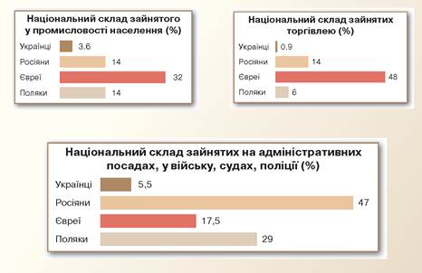Єврейське населення зосереджувалося більше у правобережних губерніях і у містах. Серед міського населення євреї становили 28 % в цілому по Україні, а на Правобережжі — більше 40 %. Головними їхніми заняттями були дрібна торгівля, ремесла і промисли. Традиційним заняттям було також лихварство. До такого стану спричинила урядова політика обмежень розселення євреїв у сільській місцевості. Уряд проводив відверто антисемітську політику: діяли заборони на професії, відсоткова норма (5-10 %) при прийомі до навчальних закладів, обмеження на економічну діяльність. Завдяки цьому у сільському господарстві наприкінці XIX ст. працювали тільки 2,5 % євреїв. Зате типовою постаттю в українському селі був єврей-орендар.